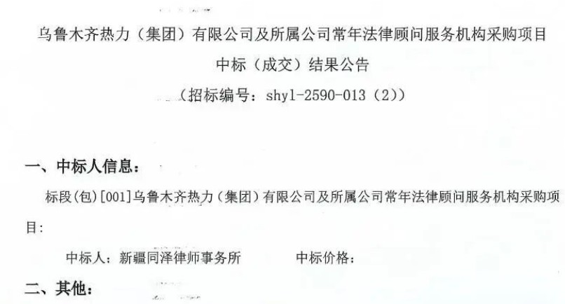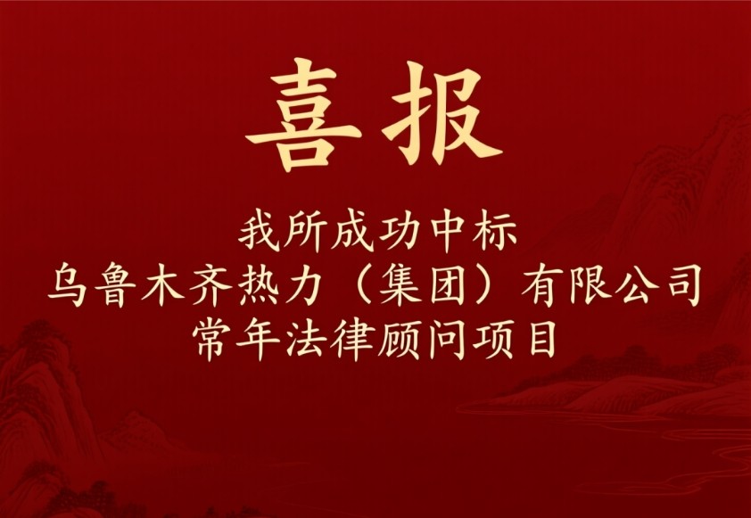 此次成功中标,是乌鲁木齐热力(集团)有限公司对我所专业能力、品牌声誉及服务品质的高度认可。我所将以此为契机,进一步提升服务质量和专业水平,为乌鲁木齐热力(集团)有限公司提供高效、精准的法律支持! |